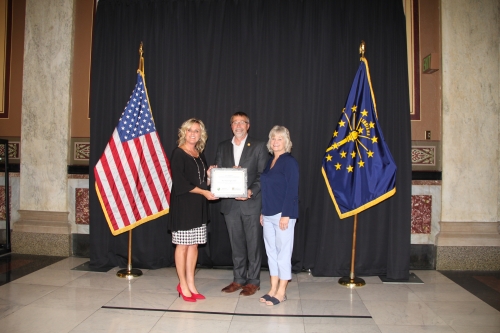 PHOTO CAPTION: State Rep. Jim Pressel (R-Rolling Prairie) accepts an Advanced Placement Award from State Superintendent of Public Instruction Dr. Jennifer McCormick on behalf of New Prairie High School on Tuesday, June 12, 2018, at the Statehouse. The school was recognized for having 25 percent or more of their graduating class earn a score of 3 out of 5 on at least one AP exam. Pictured left to right: McCormick; Pressel; and Becky Pressel.