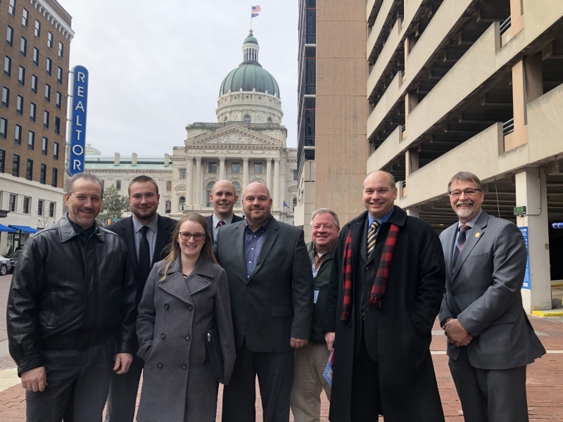 CAPTION: State Rep. Jim Pressel (R-Rolling Prairie) (far right) welcomes LaPorte County Farm Bureau members Wednesday, Jan. 22, 2020, to the Statehouse in Indianapolis. The group met with Pressel to discuss health care and agriculture issues as they relate to LaPorte County. Pictured from left to right: Daron Bruder, Jack Missal, Indiana Farm Bureau Regional Manager Marissa Mikel, Matt Schafer, Mark Parkman, Mike Schultz, Luke Minich and Pressel.