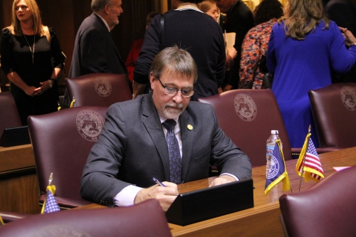 CAPTION: State Rep. Jim Pressel (R-Rolling Prairie) prepares for the 2019 legislative session while attending Organization Day at the Statehouse on Tuesday, Nov. 20, 2018. Organization Day marks the ceremonial start to the 2019 legislative session.