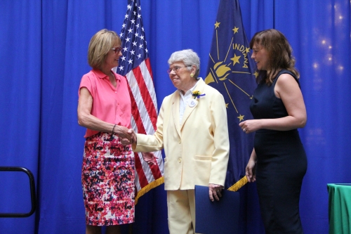 Photo Caption: Lt. Gov. Suzanne Crouch presents Marilyn Skinner of Kokomo with a Golden Hoosier Award on Thursday, June 21, 2018. Skinner received the award at the Statehouse for her decades of service and commitment to the community through her education advocacy efforts and more. The Golden Hoosier Award is the highest honor bestowed on those in Indiana who are at least 65 years old.